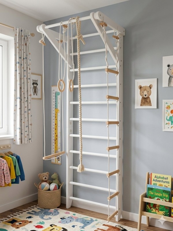 Iščete večnamensko športno opremo, ki bo navdušila otroke in obenem omogočila vadbo tudi odraslim? Naš lesen letvenik v elegantni beli barvi z dodatki je popolna rešitev za aktivno življenje doma – varen, kompakten in narejen iz kakovostnih naravnih materialov. Njegova svetla barva se odlično poda v vsak prostor in daje občutek svežine ter čistosti.