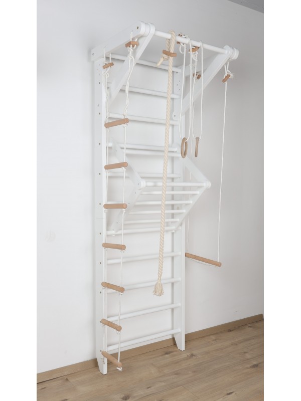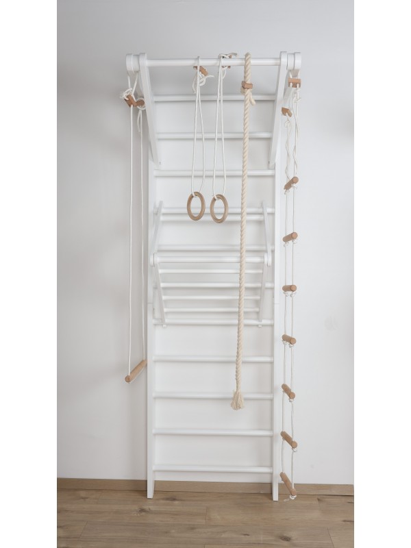 Iščete elegantno in funkcionalno vadbeno opremo, ki bo razveselila otroke in odrasle? Naš beli letvenik z dodatki združuje vrhunsko kakovost, brezčasno estetiko in popolno vsestranskost! Izdelan je v Evropi iz naravnega bukovega lesa, pobarvan z otrokom prijaznimi HIDROHEL premazi v sodobni beli barvi, ki se popolnoma ujema z vsako notranjo opremo. Zaradi svoje kompaktne zasnove je idealen za vsak dom – za otroško sobo, igralnico ali dnevni prostor. Z enim izdelkom dobite vadbeno postajo za odrasle in igralno plezalno strukturo za otroke.